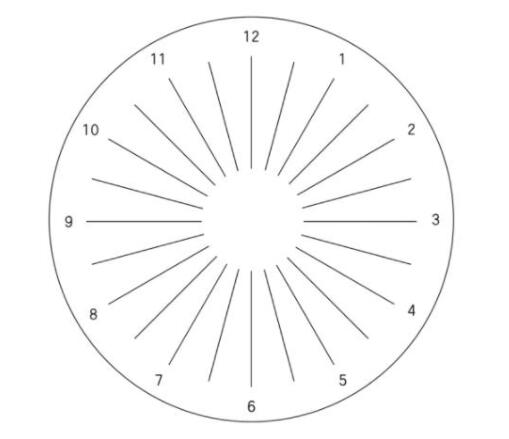 ● 一旦发现某一条线,或某一个方向的几个线条颜色比较深,说明这只眼睛可能有散光,而眼睛所看到的颜色最黑的线条对应的数字乘以 30,就是散光轴向。
